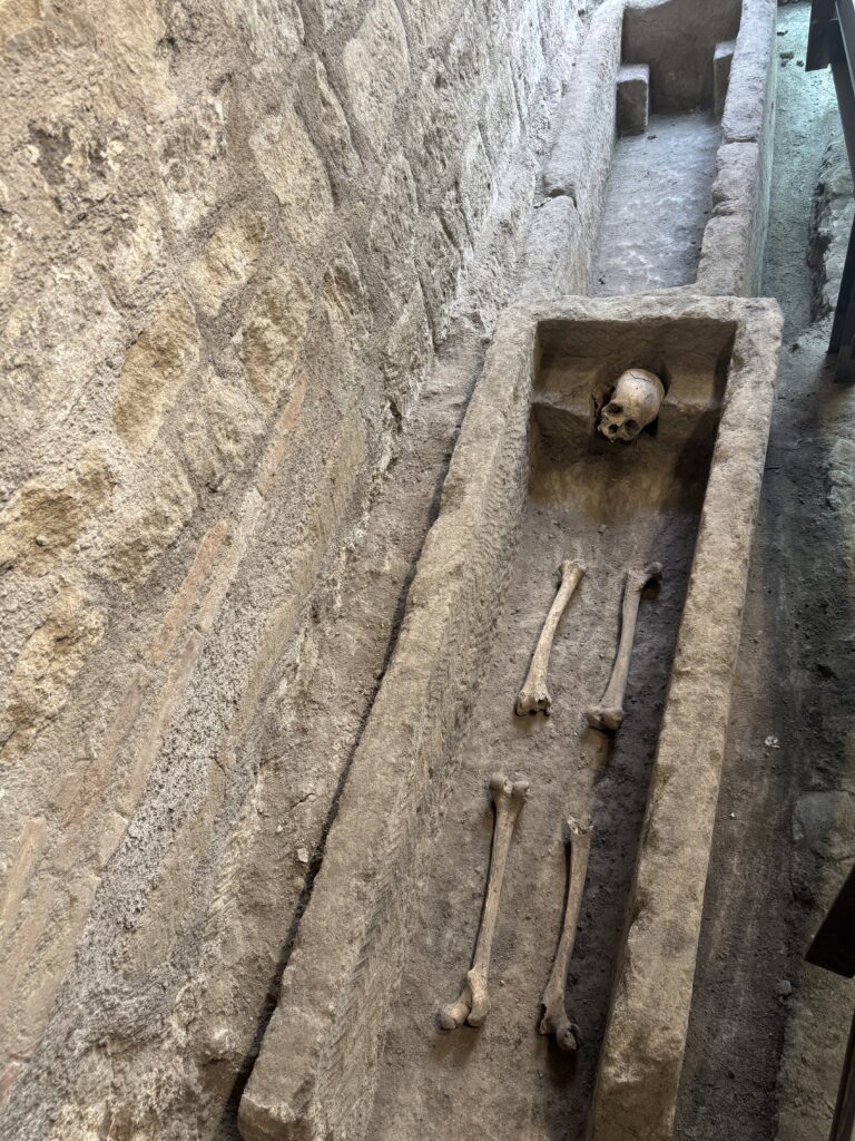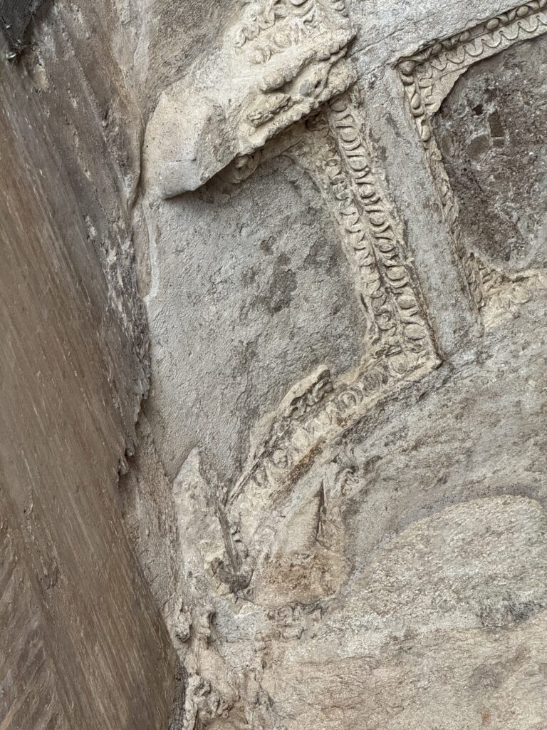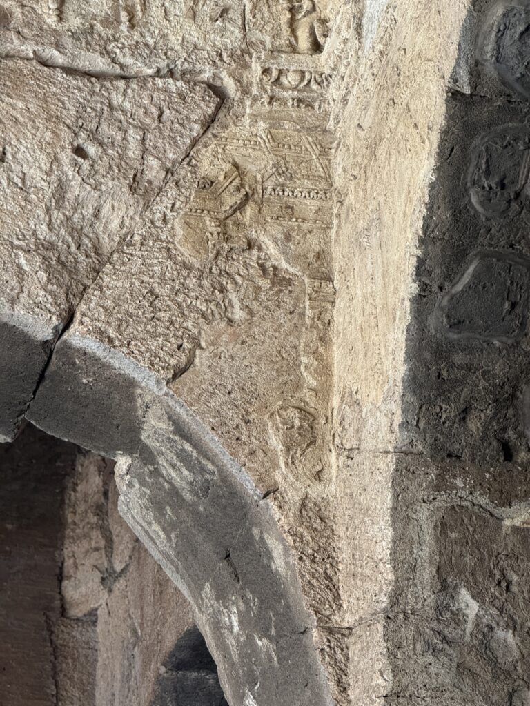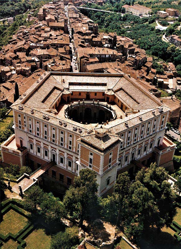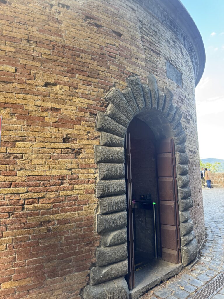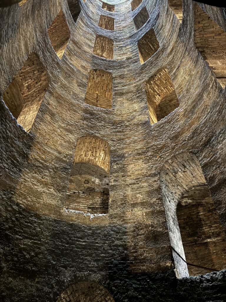 Byggdes med travertin kalksten, vulkanisk sten även kallad tofu, samt tegelklädd betong.