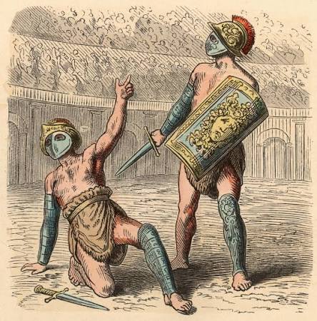 tummen upp för en gladiator motsatt till vad som oftast visas i filmer; det signalerade att gladiatorn skulle dödas. Nåd visades istället genom en gest som antingen var en knuten näve eller en tumme som var instucken i en knuten näve.