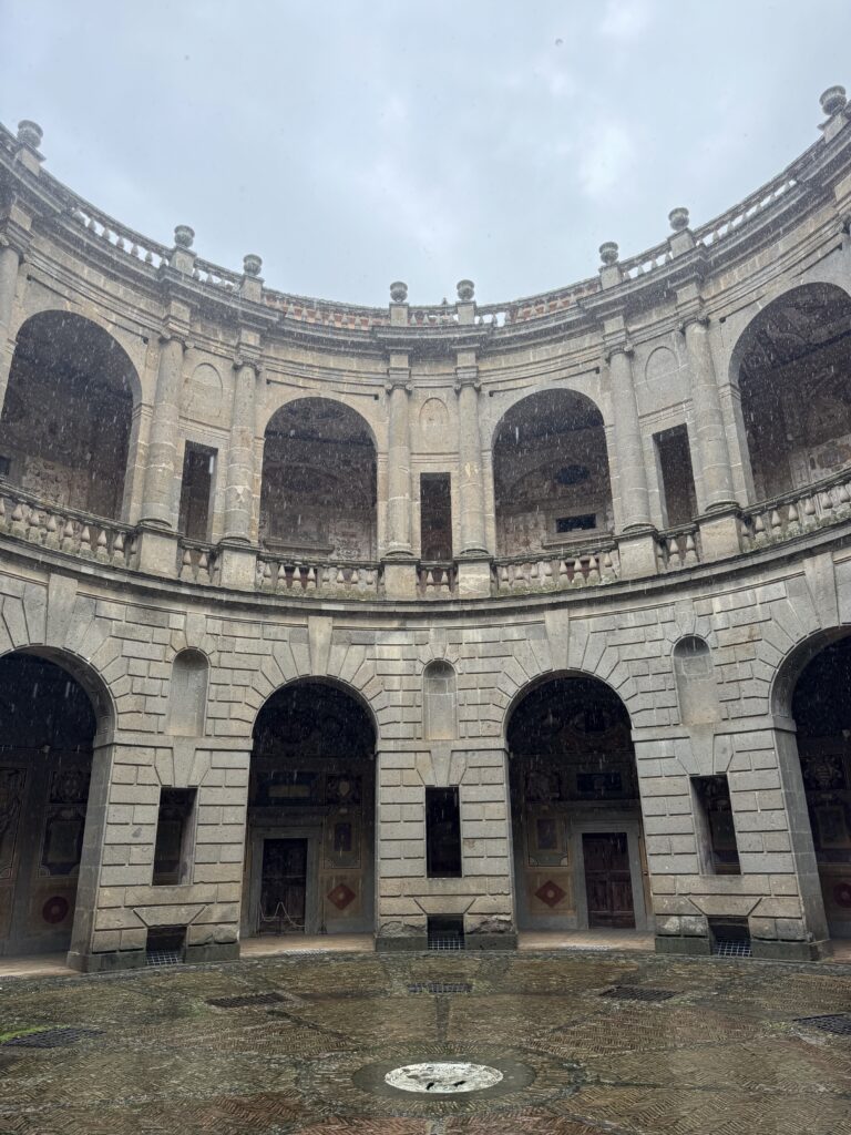 Byggdes med travertin kalksten, vulkanisk sten även kallad tofu, samt tegelklädd betong.